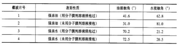 眾所周知,可以通過測量接觸角的變化趨勢來反映巖石表面濕潤性變化趨勢,接觸角越小,潤濕性越好,接觸角越大,潤濕性越差,因此,測量用分子膜溶液浸泡前后巖石表面接觸角的變化趨勢,也就定性的分析了膜劑溶液對巖石表面潤濕性的影響。